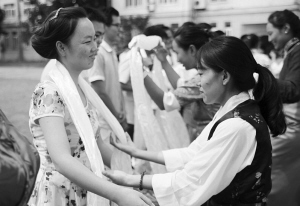 藏族学生向来自浙江的支教老师表达祝福。 王丽炜摄