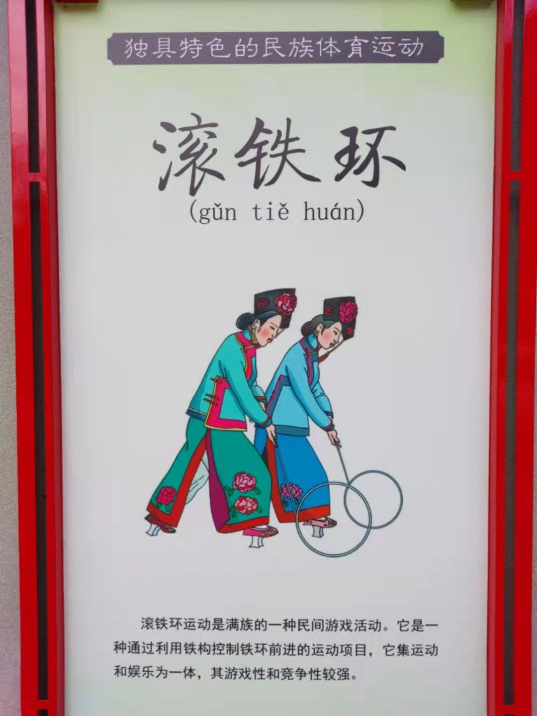滚铁环运动是满族的一种民间游戏活动。它是一种通过利用铁构控制铁环前进的运动项目,它集运动和娱乐为一体,其游戏性和竞争性较强。