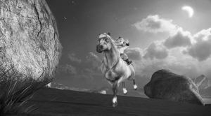 飞毛腿一听急了,赶紧跳上白雪马,说:“白雪马,出发!”