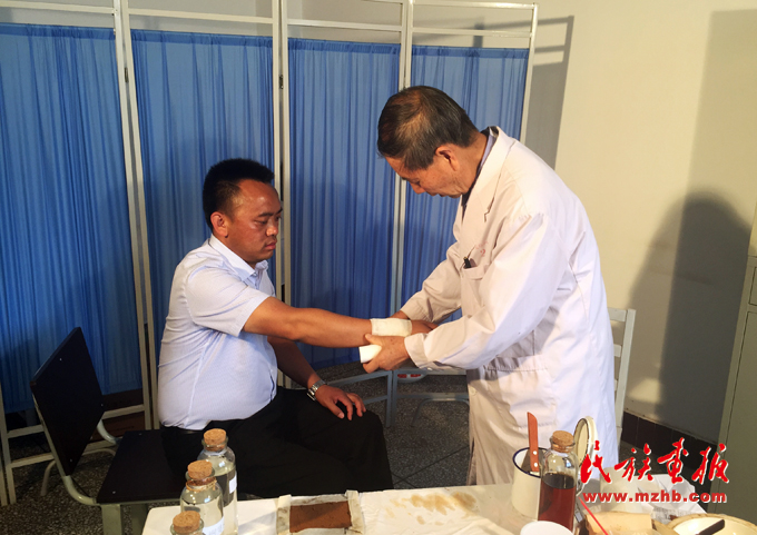 “老彝医”余惠祥现场展示水膏药的使用方法