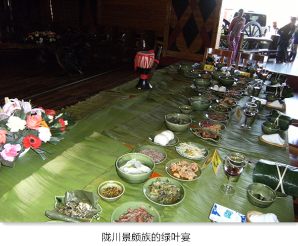在边疆文化旅游开发中,品尝民族风味美食是吸引游客的一个重要项目。德宏州当地的一些少数民族,经营他们的民族特色食品,同时伴以民俗歌舞表演,有许多办得很成功。一些民族特色食品也借着旅游的推动广为传播,为越来越多的人们所喜爱,如傣族的米酒、糯米香茶、牛撒撇、牛肉干巴丝、香草烤鱼,景颇族的鬼鸡、舂菜、竹筒烧牛肉和傈僳族的烤乳猪、同心酒等等。其中景颇族的“绿叶宴”办得极其有特色。但是这种用芭蕉叶包着饭菜的就餐方式不只景颇族独有,德昂族过去也有由于缺乏锅碗瓢盆,吃饭不用碗筷的历史。樊绰《蛮书》曾记载,扑子蛮“其土无食器,以芭蕉叶籍之”。这种情况一直延续到新中国成立前夕。如帮外寨当时吃饭就很少用碗筷,用芭蕉叶包着用手抓着吃。但是过去很少有人想到这种落后的生活方式还有什么开发的价值,而景颇族却将“以芭蕉叶籍之”的饮食方法挖掘出来,赋予了“绿色食品”的新含意。