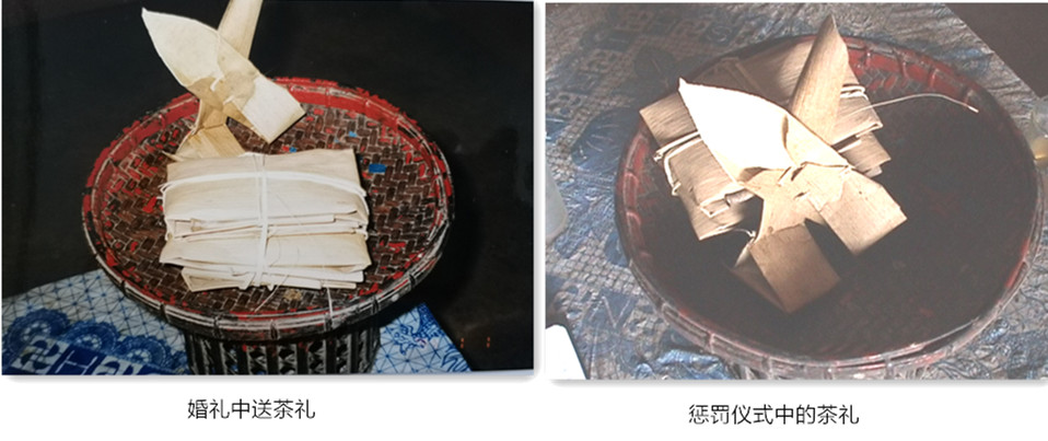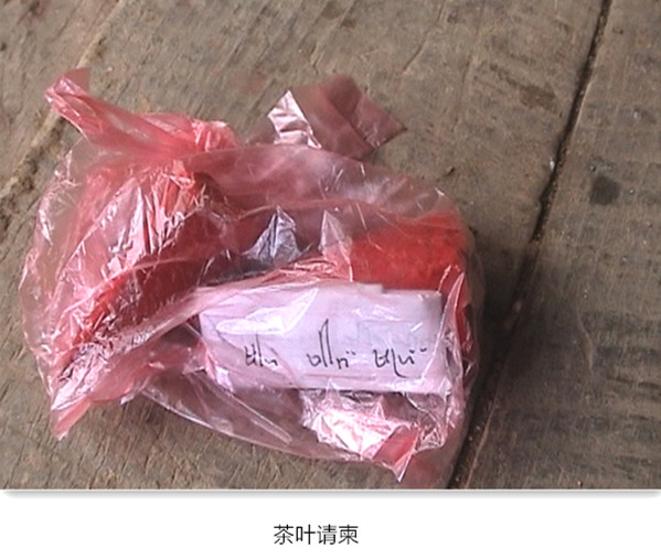 何先生当场示范了“投”的做法,就是用竹笋叶各包一小包茶和草烟丝(分量很小,只具象征意义),用竹针钉在一起,交叉成三角状,并折叠成跪着的人的形状放在献盘上,献礼人双手捧着这种称为“投”的献盘跪着向主人求情,一遍不行就求第二遍,重复到第三遍就是最高的礼了,在这种情况下被求的人一般不好意思再拒绝,如果拒绝了就是不尽人情了。茶叶作为礼物,其象征意义远远大于实用价值,这一功能在惩罚性仪式中可以说是发挥到了极致。