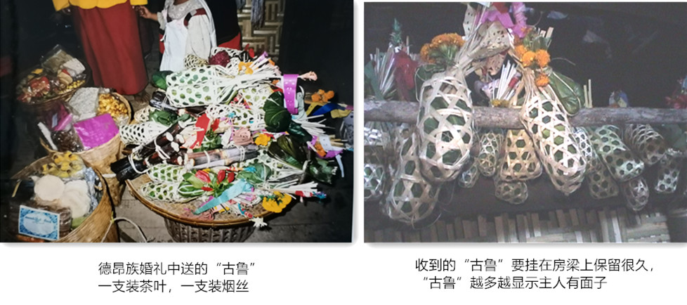 比较有意思的是,这里面的物品不论从重量还是从实用价值上看都是微不足道的,但是在德昂族看来,如果在礼品中没有茶叶和烟丝,就是不懂礼的表现。因此在德昂族社会的大事小情等场面,送一包茶叶是必不可少的。主人收到装有茶叶的“古鲁”礼品后,会把它一一挂在房梁上,摆成长长的几串,配上上面挂着的红布条等,五颜六色非常好看。梁上挂的“古鲁”越多,表明来的客人越多,主人越有面子。