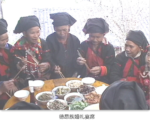 过去德昂族饮食结构比较单一,随着生活水平的提高,其饮食也在向多样化发展。如过去不吃炒菜,现在举办结婚宴席时,也往往请一些厨师帮助做几个傣族菜或炒几个汉族菜。2002年笔者在三台山进行第二次调研时,就参加了一个德昂族的婚礼,他们请厨师做的婚礼宴席至有8个大碗,菜肴以汉族菜为主,但也有带有傣族、德昂族特点的菜。