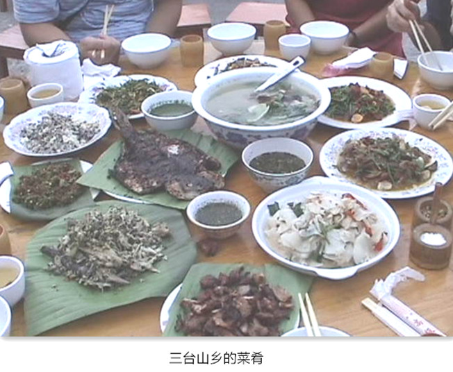 在2000年调研结束时,乡政府为了招待我们就曾做了一桌民族风味饭菜,这些菜就体现了当地饮食文化的多样性和各民族饮食相互交融的特点,其中傣族风味的有“牛撒撇”、香茅草烤鱼和枇杷叶子煮猪肉,景颇族风味菜有鬼鸡、烤猪肉和榨菜炖牛肉。德昂族的特色菜有三样,一是老虎姜干巴,主料是烤熟的牛干巴伴以切碎的老虎姜和酸调料,红红绿绿,有汤有水,味道独特。二是酸竹笋,是将酸竹笋用白水煮熟,沾着沾水吃,味道酸辣可口。三是芋头叶子菜,将芋头叶子煮熟捣碎,用芭蕉叶包成小包,是地地道道的绿色食品。