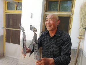 曹宗让既是非遗项目民勤骆驼客的省级传承人,也是民勤民歌省级传承人,还是民勤皮影戏市级传承人。图为曹宗让展示表演时用过的皮影。 王文仁摄