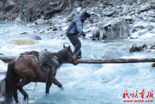 居马泰·俄白克行走在独木桥上(刘灵波 摄影)