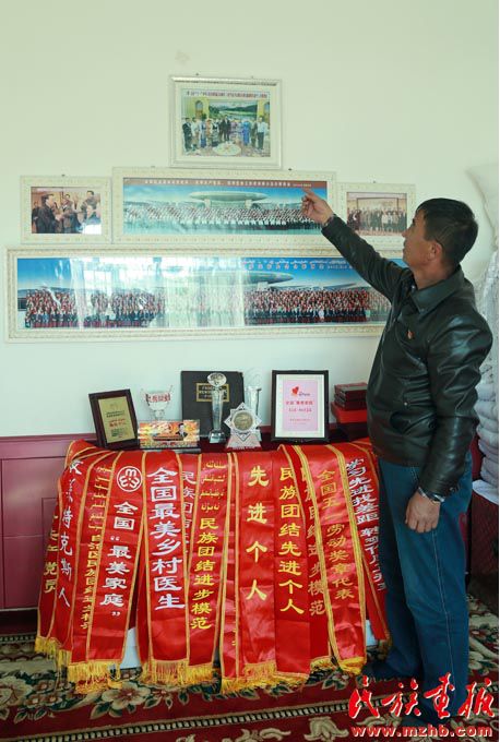 居马泰·俄白克激动地指着墙上的照片说,2015年9月30日习近平总书记在人民大会堂亲切接见了我们这些基层民族团结的代表。习近平总书记 “全面建成小康社会,一个民族都不能少”成为了他今后工作和生活的明灯。回来后,居马泰·俄白克并没有闲下来,在岗位上、生活中,民族团结的故事时刻都在他的周围发生