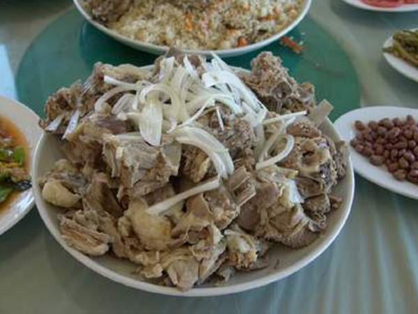 在新疆的哈萨克族中,手抓羊肉一般被称为“那仁”,最上面撒着一层洋葱,然后是满满的肉,最下面铺着主食,一般都是宽宽的皮带面或者面片儿。在新疆,洋葱被称为“皮牙子”,一般都是生吃,随手抓羊肉上来的洋葱,只切成片,不加任何调料,是羊肉最好的搭配。“那仁”也可以用马肉制作,那则是另一种风味了。