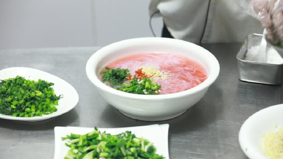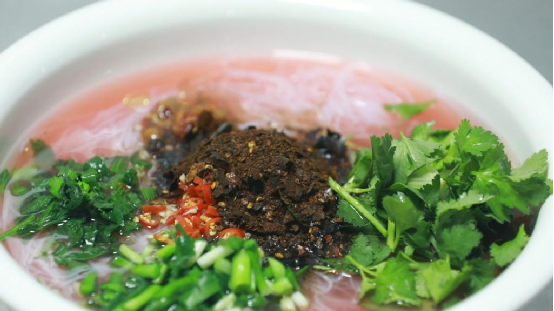 粉红的酸汤、青绿的佐料、雪白的粉丝,让酸汤粉丝这道佳肴色、香、味俱全,汤汁酸爽不失鲜美,成为了广南人年夜饭桌上必不可少的酸辣开胃菜。