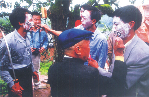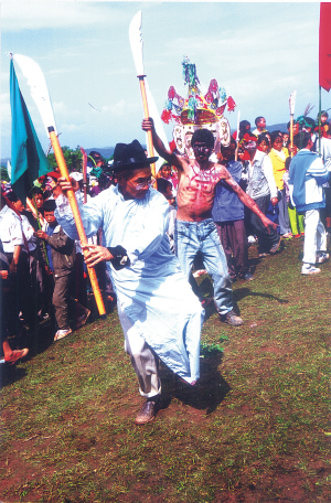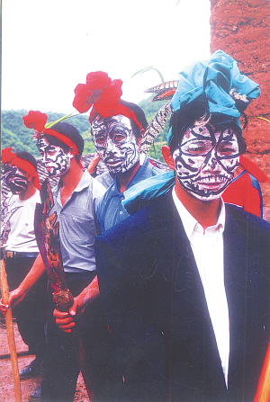 跳傩队到农户家中表演时,一个个装扮成诸葛亮、关羽和孟获等人的形象,在傩舞队和几十面彩旗大刀的护卫引导下,在院内穿行。土炮和锣鼓声中,村民们的喝彩声不断,场面热闹异常。毕摩诵祭经后,傩舞队便在门前跳起大刀舞。据说大刀舞有71种套路,其中又有各种变化。