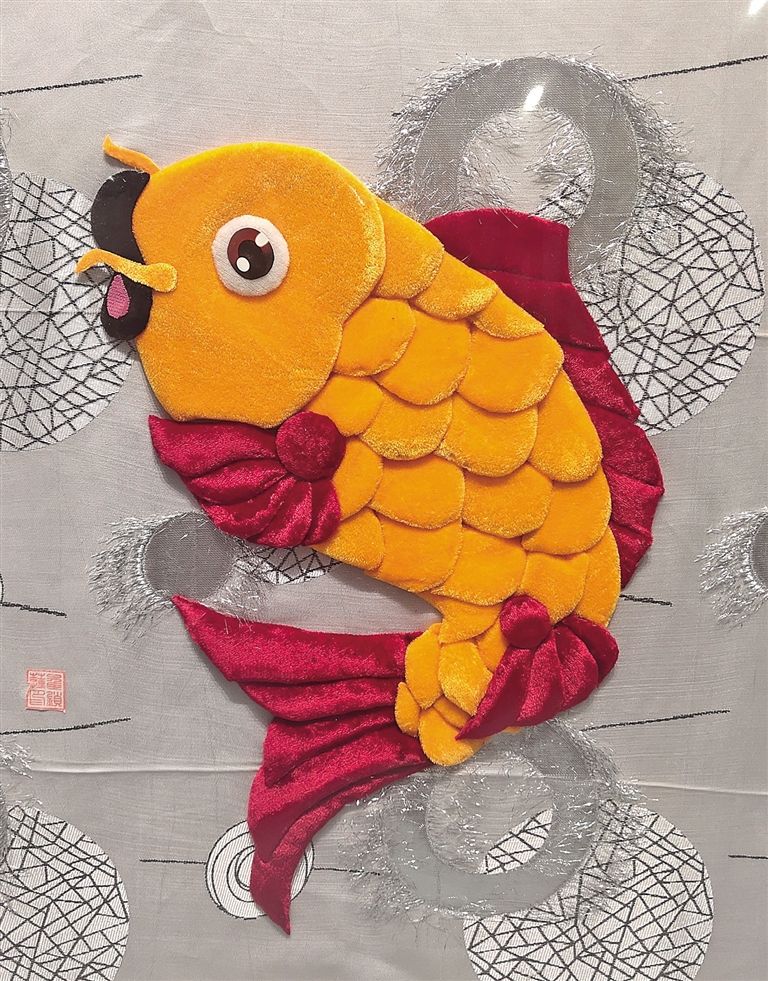“材料的选择、图案的设计、颜色的搭配,布贴画工艺越复杂,就越显精致。”崔锁莲说。