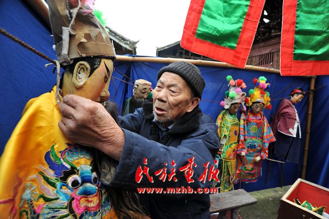 家住贵州省石阡县花桥村 85 岁的老人付正华,是石阡杖头木偶戏的第七代传人,同时是国家级“非遗”传承人。他 10 岁起开始学习木偶戏,至今已与木偶戏相伴了 75 年。