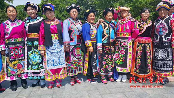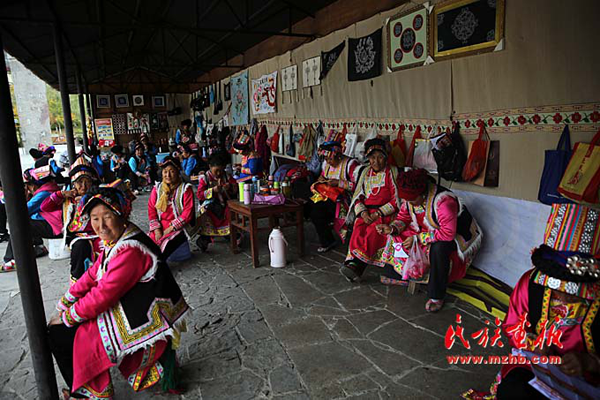 妇女们的衣物就是一个移动的羌绣展示