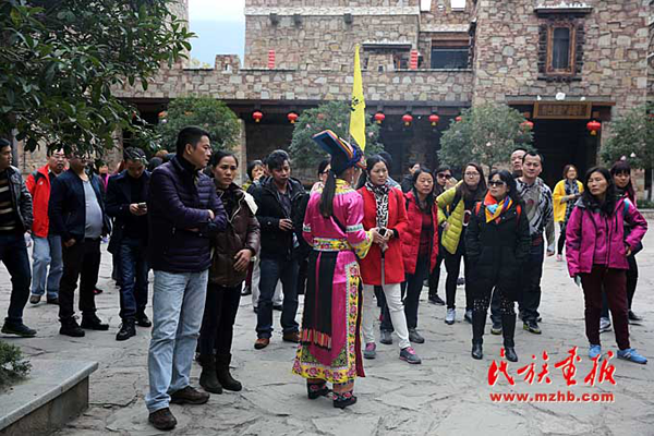 游客们饶有兴致地听导游介绍羌族文化