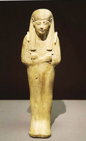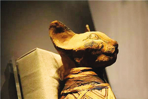 猫因为能捕杀蝎子、蛇、鼠等危害人类的动物,很早就受到埃及人的重视,并且从古王国时期开始成为宠物。展品《猫木乃伊》将猫的面部特征直接描绘在亚麻布上,缠裹猫身的亚麻布被编织成同心菱形图案。在尼罗河三角洲的布巴斯提斯地区,呈现为猫或猫头人身的巴斯塔特女神受到极度崇拜。被人供奉的猫死后会被人们用香料涂身、放入特制的棺材内,埋葬在供奉猫的神庙周围的墓地里。不少人甚至把猫木乃伊作为献给巴斯塔特的祭品,希望借此得到女神的眷顾。猫木乃伊成了许愿和还愿物。