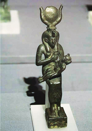 在古埃及,伊西斯抚育荷鲁斯的塑像,既是虔诚的信徒祭奠万物之母伊西斯的供物,也是求子心切的人许愿和还愿时献给女神的物品。这一形象也被认为是圣母玛利亚怀抱耶稣形象的雏形。为了躲避赛特的追杀,伊西斯逃到尼罗河三角洲一个隐蔽的地方,在那里把荷鲁斯养育成人。她不仅是贤妻良母的典范,也是受压迫者的保护神、妇女的助手、弱势群体的安慰者。