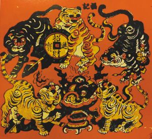 道教祖师张天师的坐骑即为黑虎,天师手持七星宝剑,驱邪逐祟,为人间除妖灭病,立德于世,位于江西鹰潭的天师府即镌刻着“道高龙虎伏,德重鬼神钦”的楹联。道教信仰的武财神赵公明也是坐骑黑虎,又称“黑虎玄坛将军”,凡经商者皆愿敬拜,以求招财进宝,辟邪祛灾。道教神系中地位至为高尚的西王母即王母娘娘是容貌慈祥端庄的大母神,但在早期文献记载中却是“其状如人,豹尾虎齿而善啸”的半人半兽形象,故西王母也称“黑虎女神”,据说她的使者和坐骑也是老虎。民间信仰中,虎是土地爷的坐骑,土地庙内常供奉老虎,叫做虎爷。大概因为虎八面威风、四方雄震,具有勇猛刚健的独特气质,所以被道教和民间尊崇为护法神、保护神,以镇邪扶正,护卫四方。