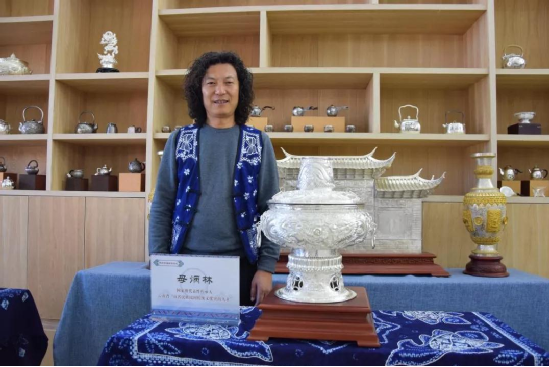 1970年出生于云南省大理州鹤庆县草海镇母屯村的母炳林,是“鹤庆银器锻制技艺”的国家级代表性传承人。6岁那年随姑姑来到工匠聚集的新华村,自小耳濡目染锻打錾花的匠人生活,1983年中学毕业后,他跟随如父如师的姑爹,挑上风箱和行李,出门走夷方。