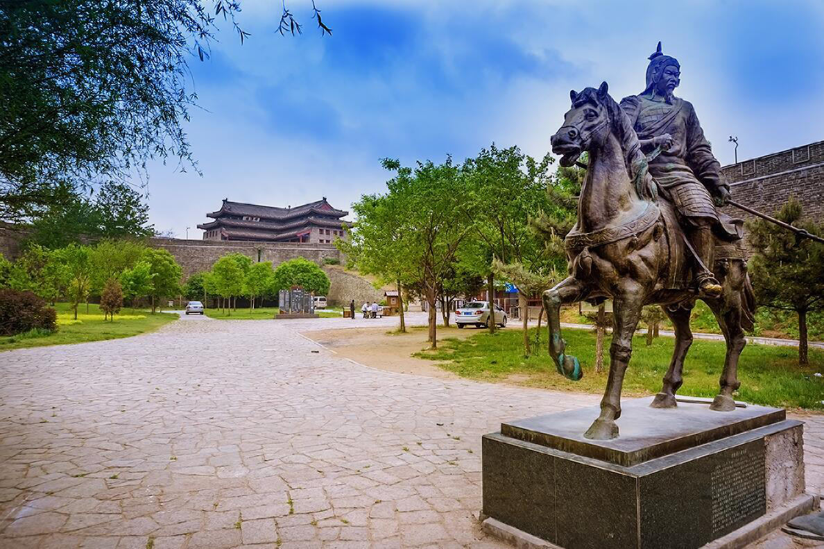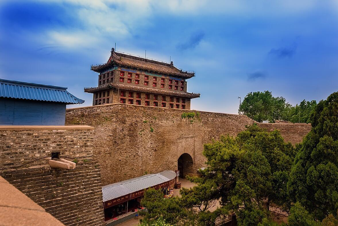山海关关城始建于明洪武十四年(1381年),是山海关长城的中心,呈不规则梯形,西北和西南转角处呈圆弧形,未设角台。关城城垣周长4727米,城高14米,厚7米。东墙为长城主线,关城东西南北四面各建有四座城门,东门为“镇东门”,即“天下第一关”,西门为“迎恩门”,南门为“望洋门”,北门为“威远门”,四门城台上均建有城门楼。