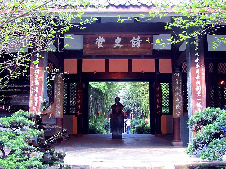 杜甫的诗“万里桥西一草堂,百花潭水即沧浪”(《狂夫》)中提到的便是此处。当时杜甫所建的茅草屋早已随风雨刮打被毁坏了,如今后人为了纪念这段杜甫便在此地修建草堂。
