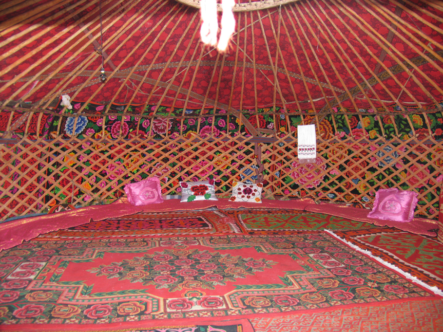 我国的塔吉克族一部分居住在毡房中,其毡房形状与蒙古族的“蒙古包”相似,但有别于“蒙古包”,它是一种轻便、简易、便于移动的住房。塔吉克族十分讲究房内的摆设,通常会用各种挂毯、地毯来作为装饰,具有浓郁的民族风格。