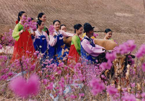 不久,就在哥哥走过的山岗,印着血迹的土地上,到处生出了许多奇异的山花,粉红的颜色飘溢着芬芳。这[][花]花性情刚烈,专门在寒冷的冰雪中顶风怒放。因为它独占春光傲群芳,所以备受长白山区人民,尤其是朝鲜族同胞的喜爱。人们深情地称这花为“长白金达莱”,把它当作春天的使者。一直到现在,人们一看到它,便想起那段悲壮的历史,于是把金达莱看作是坚贞、顽强的民族精神,又是美好、幸福、吉祥的象征。因而朝鲜族男女老少崇敬金达莱的深意,也就不言而喻了。