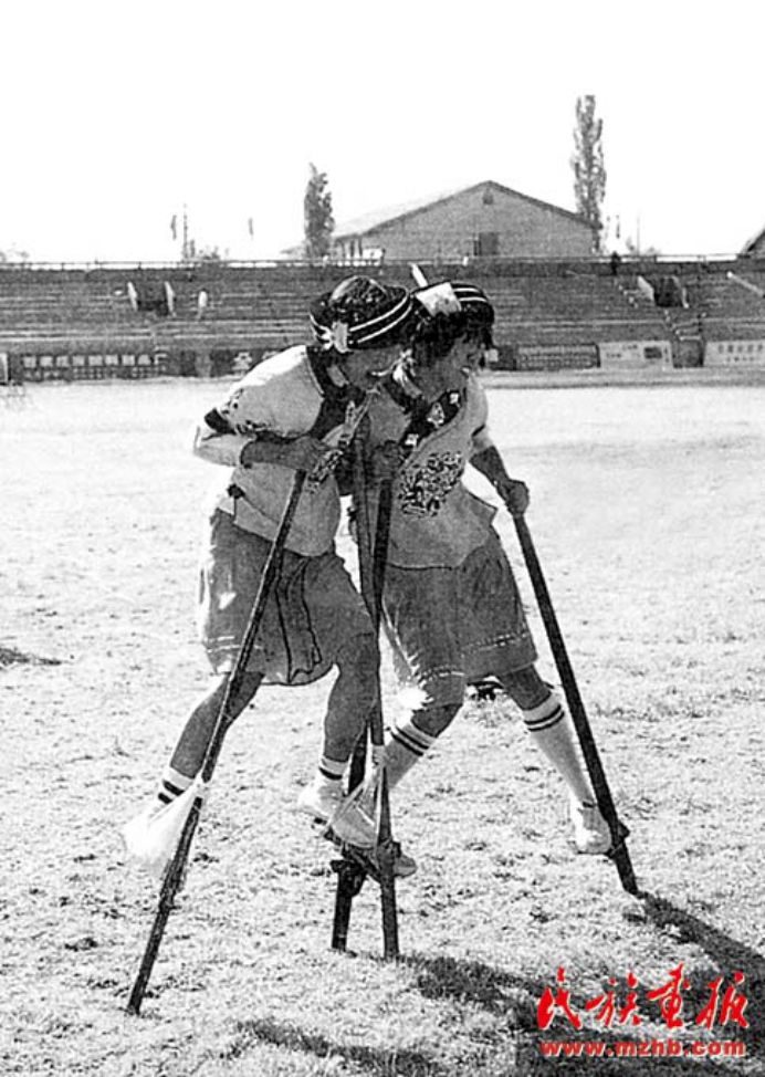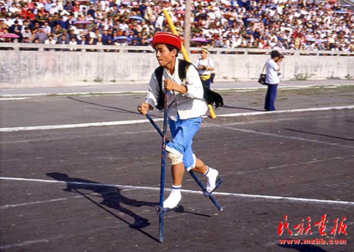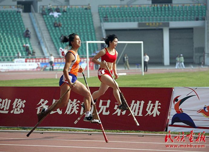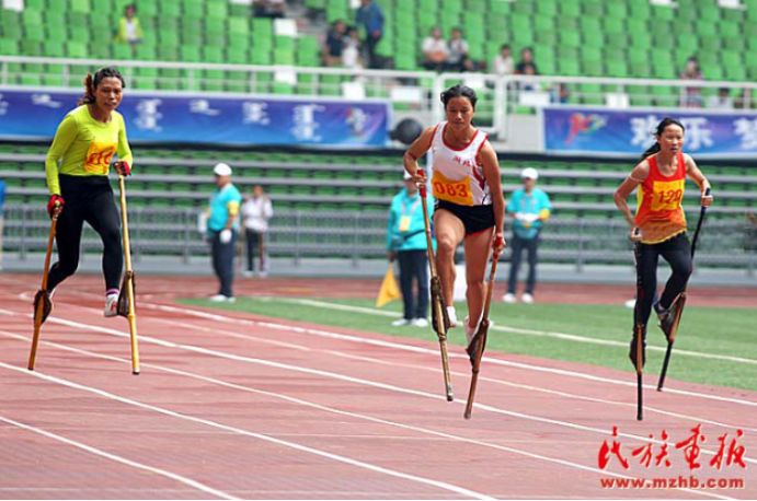 图为第八届全国少数民族传统体育运动会女子100米高脚竞速