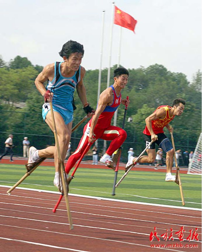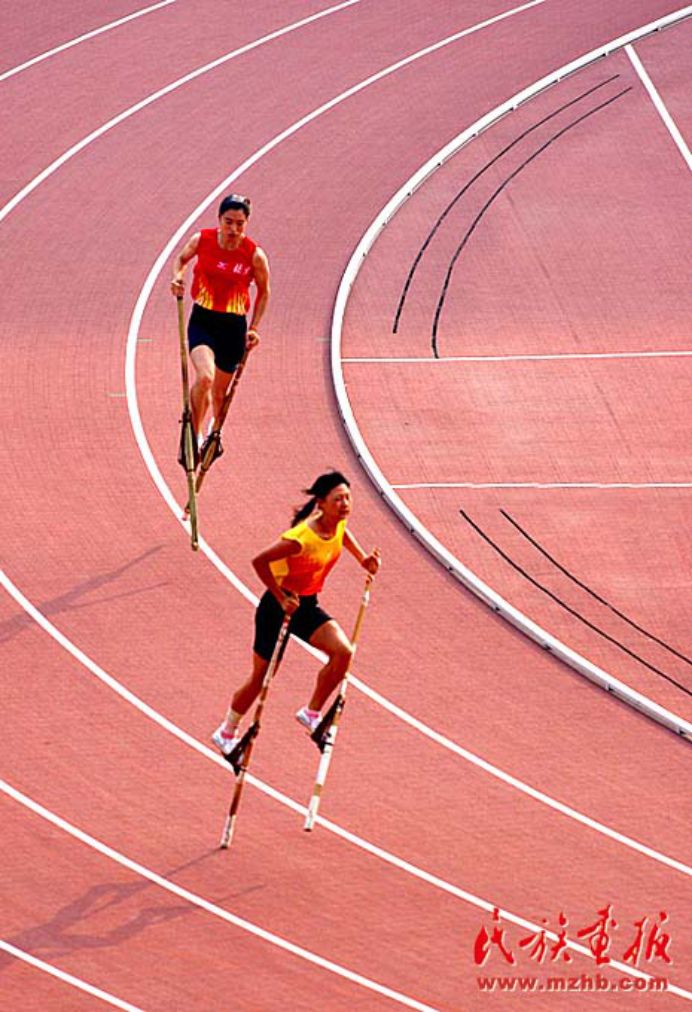 高脚竞速分为50米、100米、200米、400米和4×100米接力跑,需要具有耐力和技艺、比赛速度的特点。图为第十届全国少数民族传统体育运动会女子100米高脚竞速