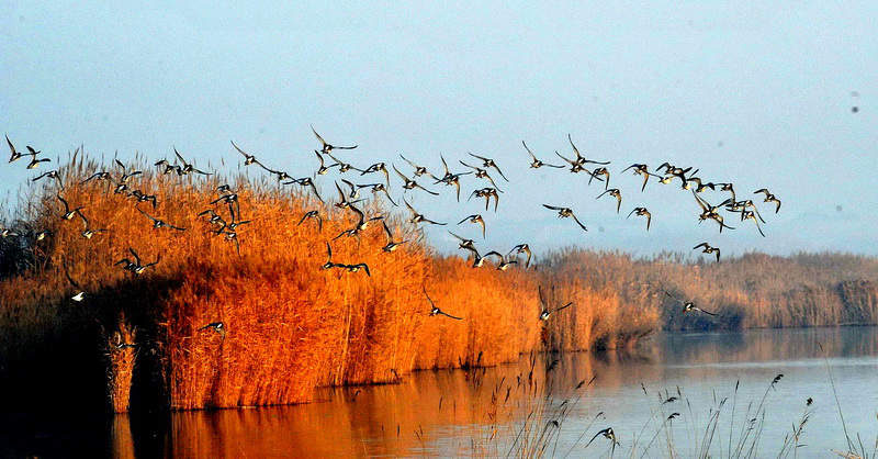 沙湖鸟岛是我国最好的观鸟地之一。春季,鸟儿产下形形色色的蛋,毛绒绒的雏鸟随处可见。春秋两季是最佳观鸟时节,轻微的响动也会惊起上万只飞鸟,黑压压一片在空中盘旋,遮天蔽日,飞鸣不已。
