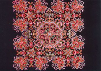 侗族刺绣工艺流行于湘、桂、黔三省交界处的侗族聚居区。图案纹样多取材于自然景物,如花、鸟、鱼、虫之类。画面生动活泼,色彩明丽。