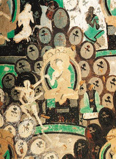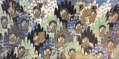 画师为何要在窟内表现菱形山峦,或者说,为什么要满窟表现一片山林环境?这要从一个故事说起。据《长阿含经》记载,当释迦牟尼在毗陀山因陀娑罗窟中入火焰三昧之时,忉利天主帝释天欲拜访佛陀,于是先令乐神般遮翼来到佛窟旁边,弹奏琉璃琴,娱乐佛陀。之后,帝释天率领群神至佛所,向佛提问。这一故事在印度流传很广,唐代的玄奘在印度游学时还看到了“帝释石室”的遗址。在古代犍陀罗雕刻中,“帝释窟说法”也是被广泛表现的题材——冥想的佛陀端坐于山岩窟穴之内,四周雕刻岩石、动物、天人……