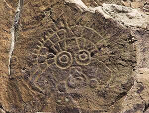 当然,也有人认为,这幅太阳神岩画其实是古代部落首领的头像。一些有功于氏族部落的首领被刻在石壁上,成为人们崇拜、祭祀的对象。也有人认为,所谓太阳神应该是地魔的形象。贺兰山一带经常有地震、山洪等地质灾害,供奉地魔的目的是为了驱邪祈福、保佑生活平安。不管初衷如何,这幅太阳神岩画都可以解读为人格化了的神灵形象,是人们祈福的对象。