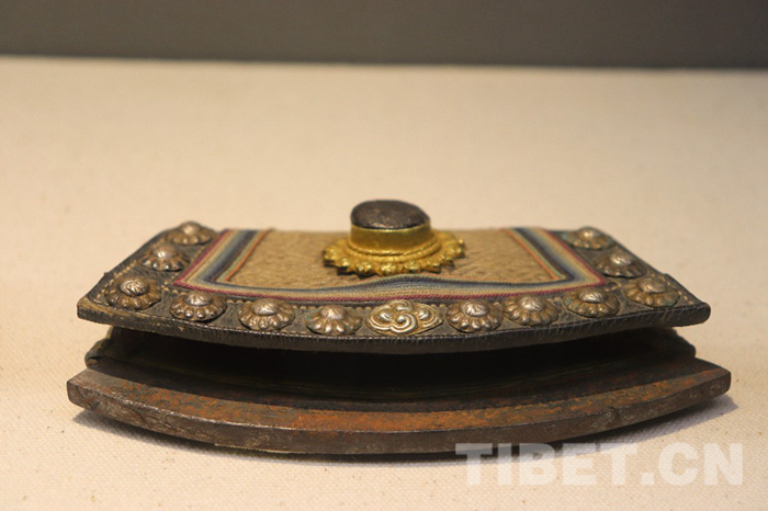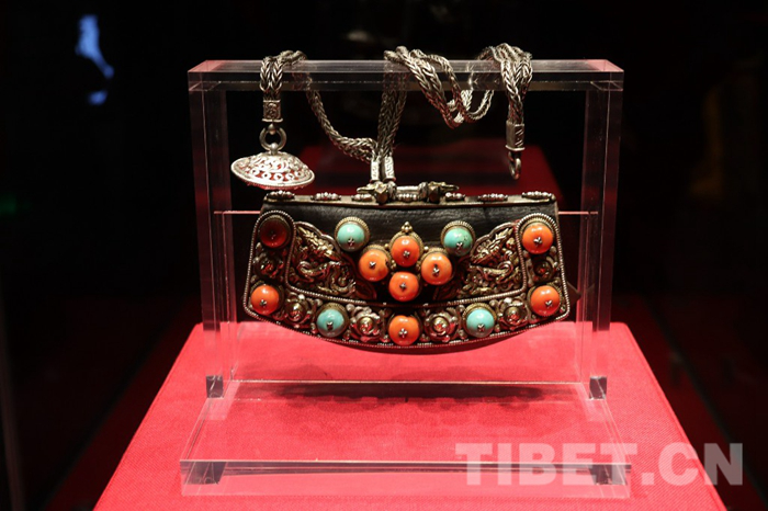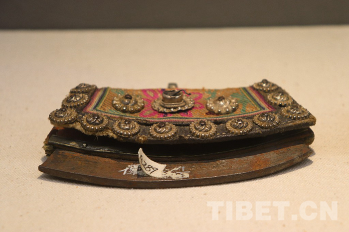 图为四川省甘孜州博物馆展出的清代皮质嵌珠打火镰(一级文物),形如镰刀,镶嵌玛瑙、红珊瑚、绿松石等宝石,极具奢华之气。摄影:孔夏