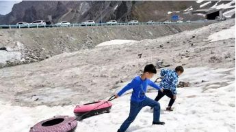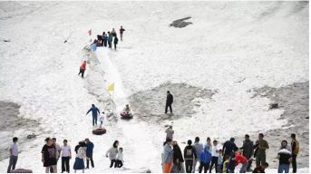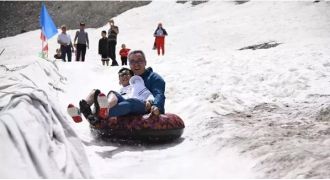行至海拔3400米的哈希勒根公路隧道附近,众多自驾游游客在此停留,玩起了滑雪,欢笑不断。