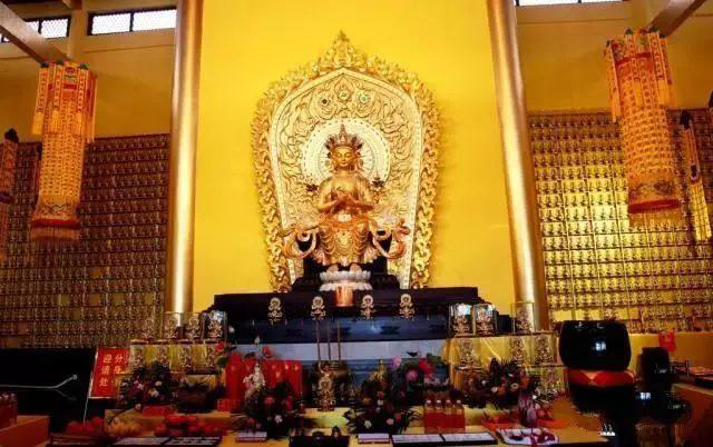 金玉弥勒圣像高达5米,耗用200多公斤黄金和数千颗名贵珠宝、钻石、翠玉,是由一批来自京城的中国工艺美术大师采用中国宫廷手工绝技敬造的世界最大的弥勒金佛。
