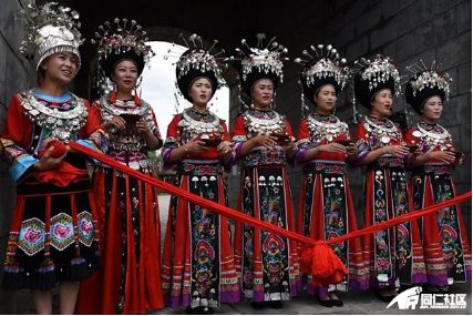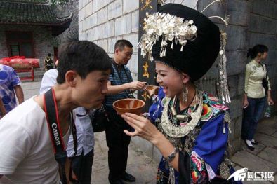 苗家人的热情好客众所周知,最为熟知的就是每逢有贵客来临,都会在城门处以拦门礼相迎。拦门礼,在当地也被称为闯三关,就是卡歌,卡酒,卡鼓这三关。在苗族有这么一句话:“拦门拦礼不拦亲,卡歌卡酒卡贵宾”。据说,要进寨必须唱上一首歌才行,儿歌,民歌,流行歌都可以,四句为一首,唱完之后加一个结束语“哟喂”,然后再喝上一碗醇美的苗家米酒。