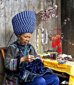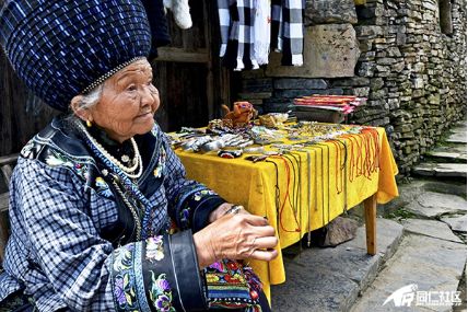 行走在古寨,路边摆摊的老人卖着一些当地的特色产品,有的还在水盆里泡着几根农家黄瓜。老人们也不吆喝,有人过问就答,没人时就说着古老的难懂的苗语聊天。年轻的苗族阿妹,有的在细致地做着蜡染,有的则带着游客游览苗家风光,讲解苗家人的民俗风情。