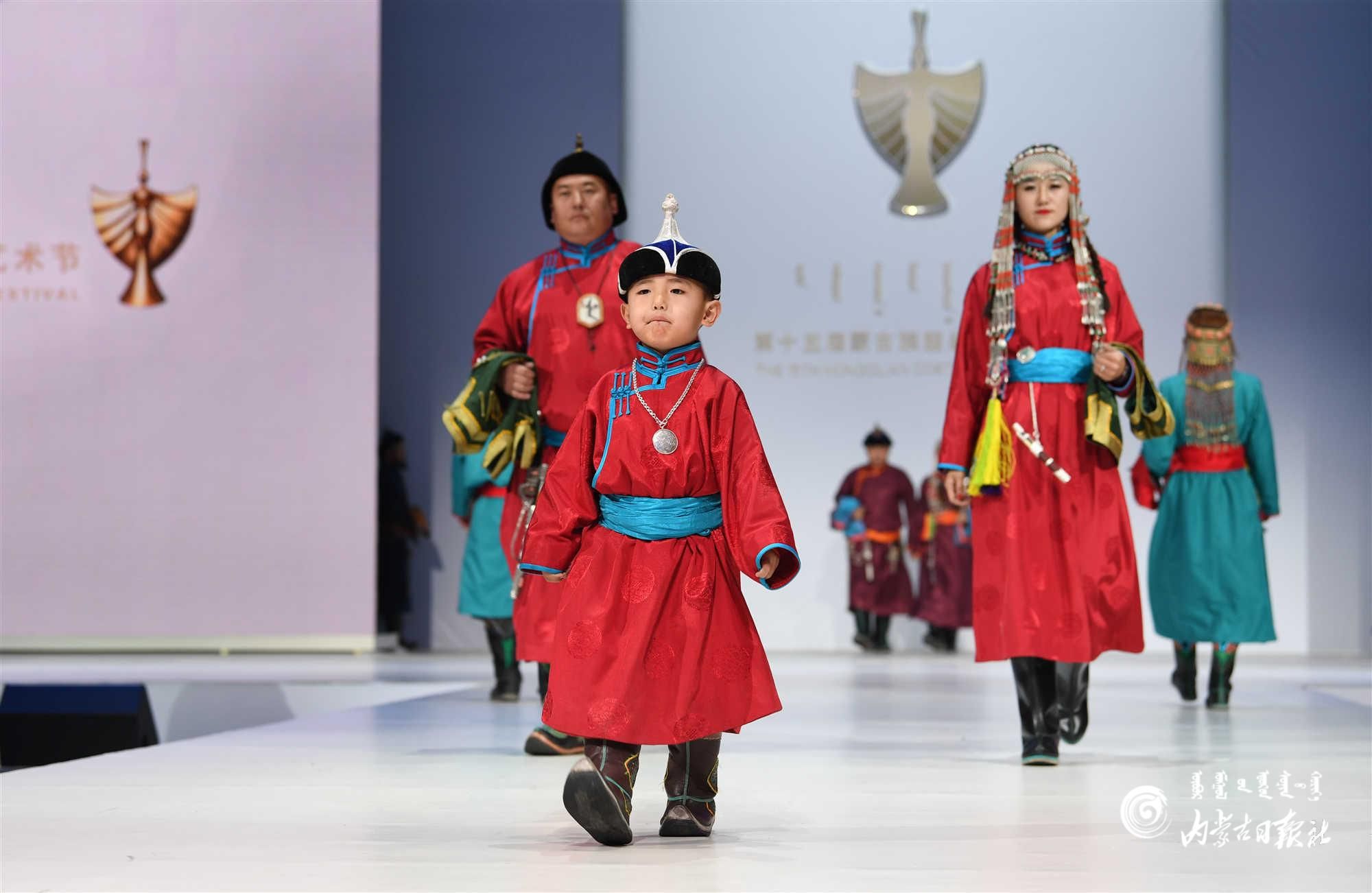 内蒙古艺术学院的学生在舞台上展示蒙古族礼服。