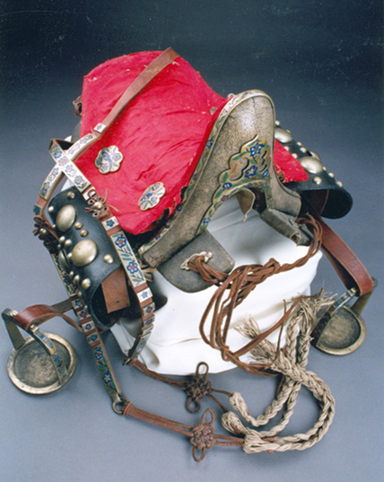 民族文化宫博物馆馆藏的这件鲨鱼皮马鞍在整个裸马鞍外面包覆价值昂贵的鲨鱼皮,不但防腐防潮,而且还起到了装饰的作用,让整个马鞍大气美观。马鞍的鞍桥部分是采用的镶嵌法装饰,装饰纹样为铜质云纹造型上镶嵌梅花图案,寓意吉祥、圣洁。在制作的时候,直接在马鞍鞍桥上錾刻出花纹,镶嵌珐琅,这样装饰的马鞍看上去更有质感。围绕鞍桥镶贴的边称作鞍桥边,用铜质制成,并镶嵌有梅花形图案。马鞍镫磨的形状为椭圆形,上面镶有5枚圆形铜泡和27枚圆形小铜泡,蒙古语称之为“陶卜如”。在马鞍上镶有8到9厘米大小的4枚铜质鞍花,蒙古语称为“达如拉嘎”。它有两个作用,一个是装饰的作用,体现在小鞍韂和鞍翅上。另一个是固定的作用,用在小鞍韂上固定鞍垫。鞍花呈花瓣形,上面是镶嵌珐琅的梅花宝瓶图案,寓意平安健康。马镫是铜质壶型的造型,马镫上沿镶嵌有吉祥八宝图案的珐琅彩,寓意富贵吉祥。马绊上全部镶嵌有铜质梅花纹样珐琅彩。马绊尾端系有平安结,寓意平平安安。整个马鞍制作精湛,选材珍贵,做工精细,纹样独特,寓意着幸福安康,表达了蒙古族人民对中央领导的无限的敬意,以及安居祥和的欢喜之情。