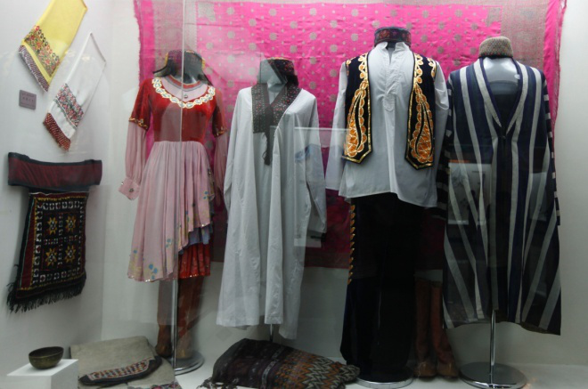 维吾尔族是讲究服饰的民族,他们善于把大自然中最美的花草,化作自己衣服上的装饰,帽是绣花帽,衣是绣花衣,鞋是绣花鞋,扎的是绣花巾,背的是绣花袋,满身鲜花盛开,到人飘香。服饰款式多彩,纹饰清晰,色彩鲜丽,图案古朴,工艺精湛。