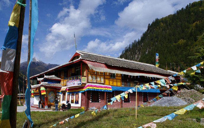 九寨沟里九个古老的藏族村寨,到处有石磨房、栈道、经幡和藏羌歌舞等,藏族特色浓郁而神秘。原始古朴的村寨散落在绿树环抱的群山之中,显得更加古老、宁静。九寨沟,平均海拔在2500米左右,属于寒温带地区,所以冬无严寒,夏无酷暑,在这里的传统的建筑大都为木结构。