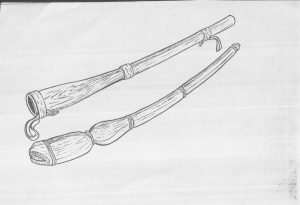 鄂伦春族猎手彪悍、好客,他们专门为我做了饼。这个饼可不同寻常,面是怎么和的呢?是在马鞍上弄的,水是冰化成的。面和好后,放在火堆里烤熟,是真正的“烧饼”。用什么煮肉呢?用木头支起一个大三脚架,架子顶上吊下来两股绳,挂着铁锅。这种铁吊锅有双耳,装着木把手,与一般锅不同的是,它的锅耳不朝外而是朝内,木把手在锅内上方,这样再大的火也烧不着。我想到,在江西曾出土内耳陶锅器,日本也有,可见这类器皿都是用来吊在篝火上烧水煮饭的。