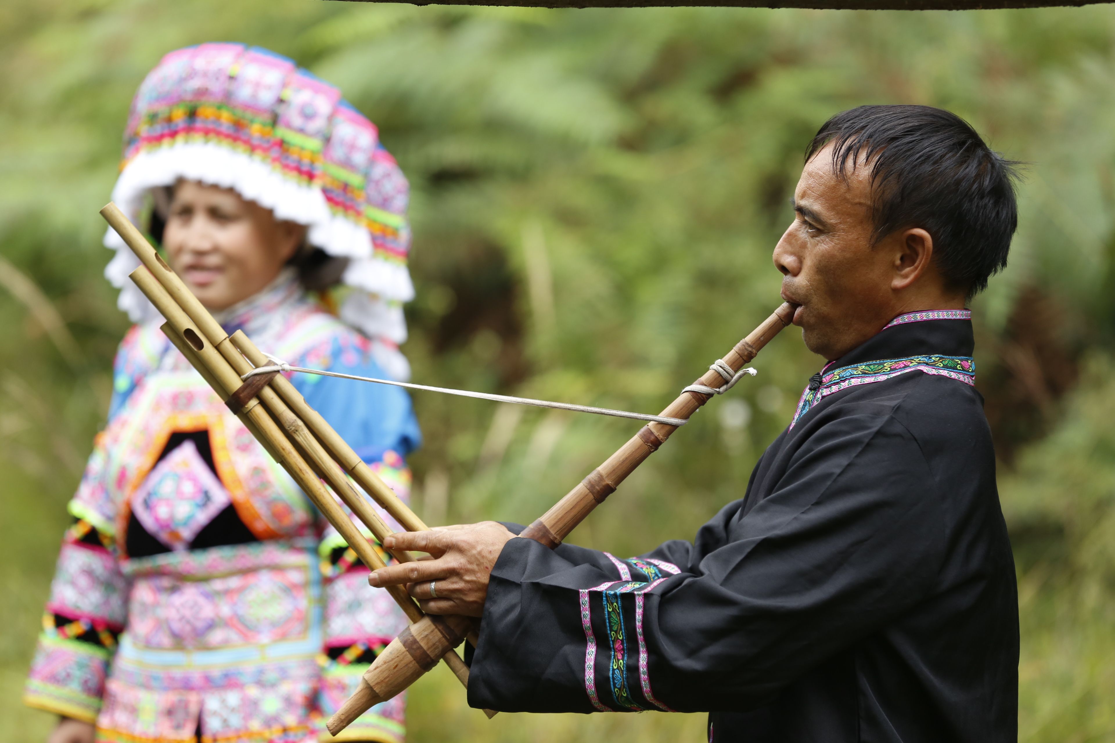 图片说明:贵州贵阳苗族跳花鼓舞时的芦笙演奏