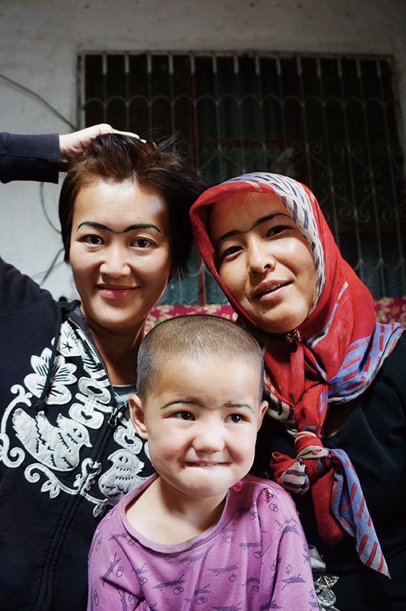 虽然语言不通,但阿帕与妹妹热依汗古丽还是常常来找我聊天。说是聊天,其实更像打哑语。没话题时,我就翻出随身带的东西,帽子、戒指、牙线、有照片的书、化妆品什么都可以拿出来折腾一番,我也知道了这里的妇女很少化现代式样的妆。过了几天热依汗古丽拿了一把草,捣碎挤出汁液,放在倒扣过来的碗底上,帮我画了一个很酷的连眉妆,同时也给家里的大大小小姑娘都画了,又说那草也可以用来染指甲。当时我嫌那种颜色不好看没染,现在想起来真觉得可惜后来我上网查了一下,这种植物叫乌斯曼,可以促进眉毛的生长。本以为它是新疆专有,不料一查却吃了一惊:乌斯曼草即板蓝根,是传统织染工艺里染蓝的天然染料。原来不同文化圈的人们都喜欢用这些植物来增色,只是增色的地方不一样罢了。