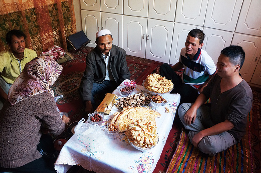 阿不列父母家的房舍,属于传统的土木结构,有个小院子。我们被簇拥着进了茶室,其三面用华丽的挂毯等织品与木柜装饰,一面开了大窗,桌上摆满了装在玻璃碗里的油炸馓子、馕、干果。喝茶在维吾尔人的日常生活中必不可少,也是招待客人的重要礼节。倒茶之前,阿不列的阿帕(妈妈)在我和唐郎的茶碗里各放了一大块冰糖,并且我发现只有我们碗里才有。想来,这是对客人特有的礼遇。