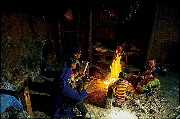 不管怎样,寒冬腊月在彝家山寨的屋子里烧盆火暖暖家是很有必要的。你看,我老舅从和平村到镇上来赶街(赶集)了,他一进屋,放下背篓,搓搓手,走向火盆,说:“真冷,烤烤火!”正在厨房做菜的父亲笑眯眯地说:“兄弟,烤好火过来喝酒!”老舅爽朗地说:“好的!”老舅边说边抬腿向餐桌走去。这时,我家又进来几个来赶街的亲戚,我母亲笑逐颜开招呼他们围到餐桌旁坐下,又到厨房炸了一盘花生米,做了几个小菜端上桌来。随后,我们家的周末聚餐开始了,差不多要到镇上散街才结束,那氛围,真温馨。那时,从文山回到马关大栗树彝山老家,看到此情景,心里总是暖暖的。这不,老表的婚事就是老舅和我父母在火塘边敲定的,大舅家起房盖屋的时间也是在火塘边敲定的,我们家及亲戚家的许多大事小务都是在火塘边敲定的,火塘与我们的生活息息相关。