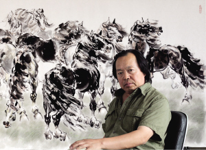 特木其勒的马是大笔挥洒奔放豪迈的写意马,刚健敏捷、强壮彪悍的骏马能让人真切地感受到蒙古民族精神的象征。