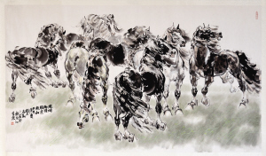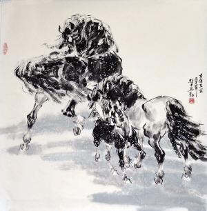 他广泛临摹前人的画马作品,对唐代韩干、宋代李公麟、元代任仁发、金代扬微、清代任伯年,当代徐悲鸿、刘勃舒等大师的画作都有深入的研究,经多年的勤奋努力,特木其勒的马已形成了他独特的艺术风格。
