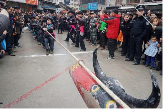 2月16日,广西柳州市融水苗族自治县杆洞乡,当地拉鼓队正在进行拉鼓拔河赛。